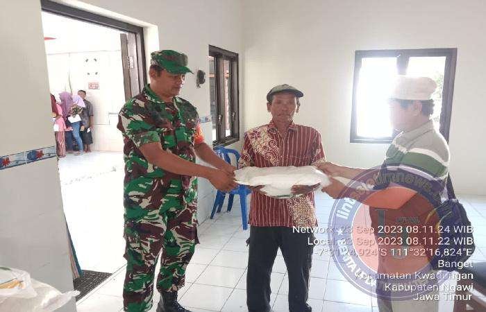 NGAWI lintasjatimnews.com – Babinsa Koramil 0805/06 Kwadungan Dampingi Penyaluran Bantuan Paket Beras Dari Pemerintah atau Badan pangan Nasional melalui PT pos Indonesia kepada warga masyarakat bertempat di balai Desa Banget, Kecamatan Kwadungan, Kabupaten Ngawi, Sabtu (23/09/2023).