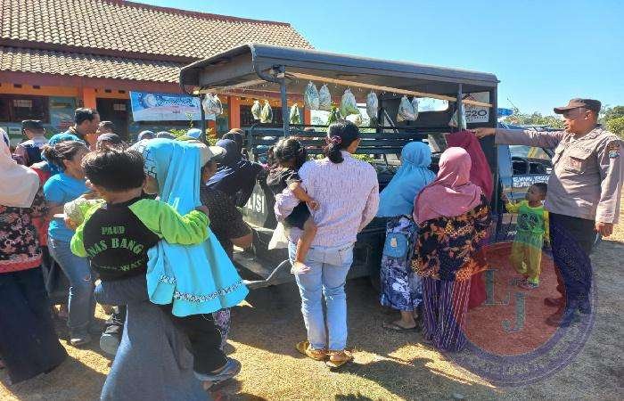 Kapolsek Wates yang turut hadir bersama Bhabinkamtibmas desa setempat dan sejumlah anggota lainnya, dengan semangat membagikan berbagai macam sayuran yang digantung di mobil dinas mereka.