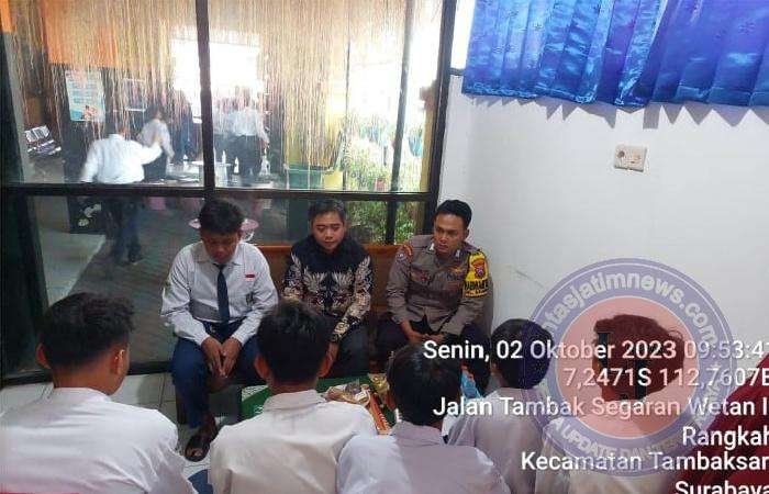 SURABAYA lintasjatimnews.com – Anggota Bhabinkamtibmas Kelurahan Rangkah Bripka Ardhi melaksanakan Giat Patroli Sambang dan memberikan Penyuluhan Kenakalan Remaja ke Siswa Siswi SMP Muhammadiyah di Jalan Tambaksegaran Wetan Surabaya Kelurahan Rangkah Kecamatan Tambaksari Surabaya serta memberikan penyuluhan Kamtibmas , Senin (02/10/2023).