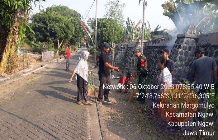 NGAWI lintasjatimnews.com – Dalam rangka meningkatkan silaturahmi dan hubungan kerja yang baik di wilayah binaan. Babinsa Koramil 01/Ngawi Serda Basori ajak bersihkan lingkungan warga melalui Kerja bakti pembersihan di lingkungan karanggeneng ,Kelurahan Margomulyo, Kecamatan Ngawi, Jum’at (06/10/2023).