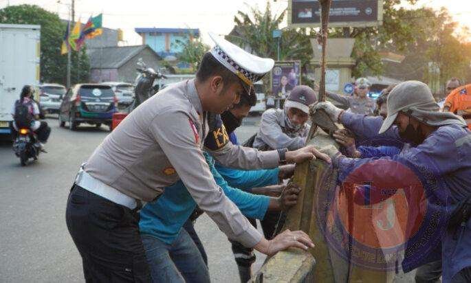 GRESIK lintasjatimnews.com – Kasat Lantas Polres Gresik AKP Mulya Sugiharto bersama personil Satlantas Polres Gresik dan Kepala Bidang Lalu Lintas Dinas Perhubungan Kabupaten Gresik, Muhammad Suudin, bersinergi melaksanakan rekayasa arus lalu lintas dengan pemasangan water barrier dan beton barrier di Jalan KH Syafi’i, simpang 4 terminal bunder. Selasa (10-10-2023)