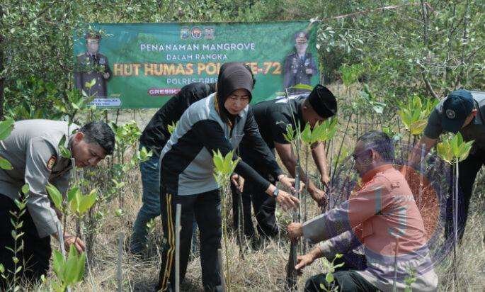 GRESIK lintasjatimnews.com – Polres Gresik menggelar penghijauan dengan menanam Pohon Mangrove secara serentak dilakukan Polri di seluruh wilayah Indonesia, Polres Gresik penanaman mangrove dilaksanakan di Kali Mireng Desa Manyar, Kecamatan Manyar, Kabupaten Gresik, Jawa Timur, dalam rangka memperingati Hari Ulang Humas Polri Ke 72.