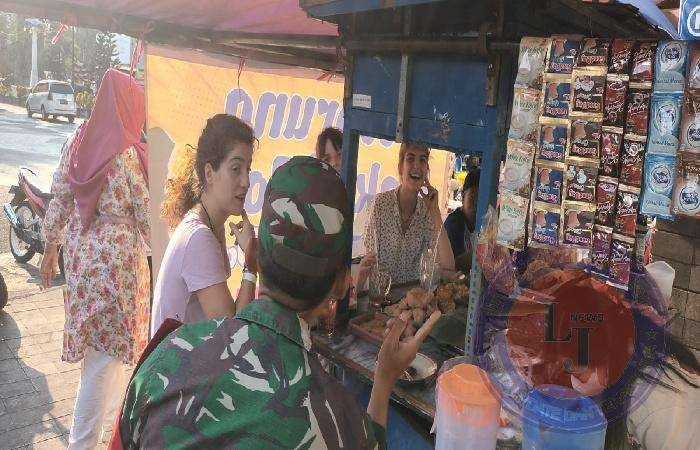 Miss Carrolin pun sedang asik bercanda gurau dengan Babinsa Sudiroprajan, sambil mencicipi wedang jahe, es teh kampul disertai dengan gorengan dan menu jajanan ringan lainnya ciri khas kota Solo, disalah satu warung Hik Bakmi Jowo Bu Siti yang berada diarea depan Pasar Gede.