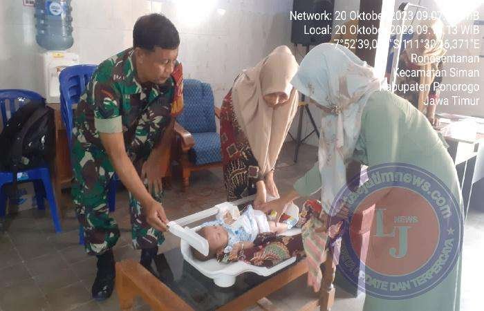 PONOROGO lintasjatimnews.com – Sertu Pamuji, anggota Koramil Tipe B 0802/04 Siman, Kodim 0802/Ponorogo yang menjabat sebagai Babinsa Ronosentanan hari ini melaksanakan pemantauan dan pendampingan pelaksanaan Posyandu Balita di Dusun Kledang, Desa Ronosentanan, Kecamatan Siman Kabupaten Ponorogo, Jumat (20/10/2023).