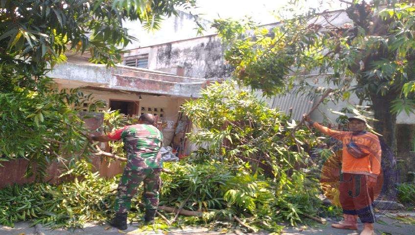 Cegah Pohon Tumbang, Babinsa Kemlayan Kerja bakti Pangkas Ranting Pohon