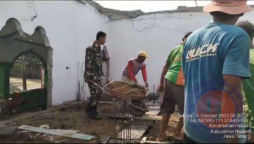 NGAWI lintasjatimnews.com – Babinsa Koramil 04/Padas Kodim 0805 Serda Guntur bersama Perangkat Desa serta Warga masyarakat melaksanakan kerja bakti Gotong royong Perbaiki tempat ibadah mushola di Desa Padas, Kecamatan Padas, Kabupaten Ngawi. Selasa (24/10/2023).