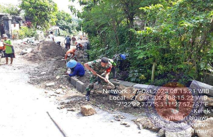 NGAWI lintasjatimnews.com – Anggota Koramil 01/Ngawi Kodim 0805/Ngawi Serda Sriyono bersama warga binaan melaksanakan gotong-royong pemasangan paving jalan di Desa Kerek Kecamatan Ngawi, Jum’at (27/10/2023).