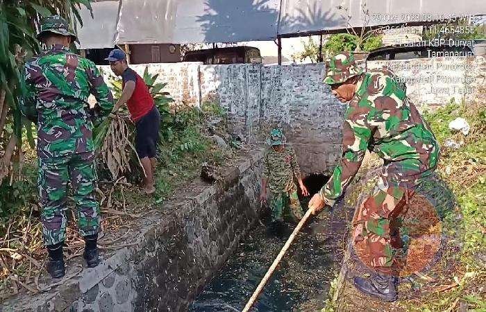 Diiringi dengan kesadaran dan semangat kebersamaan serta jiwa gotong royong, baik anggota Koramil Tipe B 0802/01 Kota Ponorogo maupun warga Kelurahan Tamanarum bersama sama membersihkan sampah yang ada di kanan dan kiri serta sepanjang saluran air dii Kelurahan Tamanarum.
