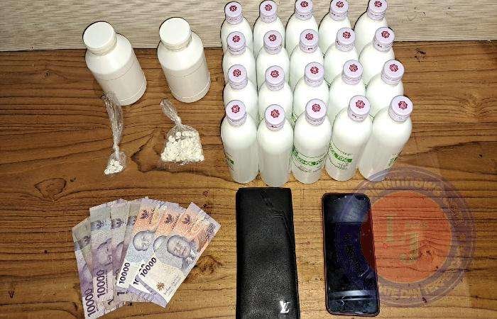 Dirumah PH, Tim Opsnal Satresnarkoba berhasil mengamankan sejumlah barang bukti diantaranya 2 kaleng plastic berisi masing-masing 1000 butir Pil Trex, 1 bungkus plastic berisi 100 butir Pil Trex, 1 bungkus plastic berisi 9 butir Pil Trex, 20 botol alkohol 70%, uang tunai Rp. 90.000 dan 1 unit HP.