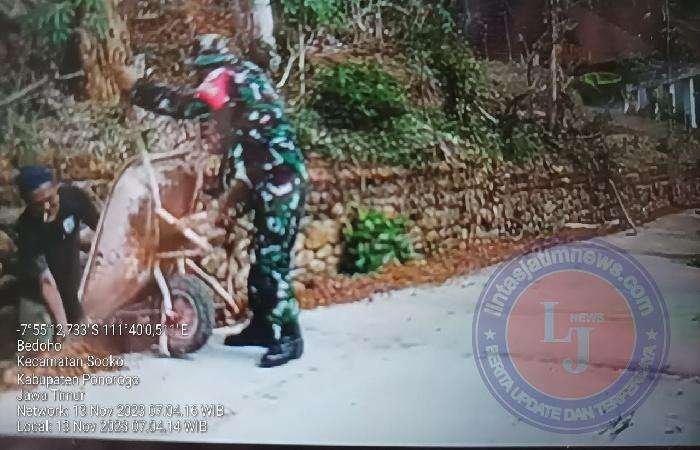 PONOROGO lintasjatimnews.com – Serda Arif S, anggota Koramil Tipe B 0802/18 Sooko, Kodim 0802/Ponorogo yang bertugas menjadi Bintara Pembina Desa (Babinsa) Bedoho hari ini melaksanakan kegiatan kerja bakti di Dukuh Jetis, Desa Bedoho, Kecamatan Sooko, Kabupaten Ponorogo, Senin (13/11/2023).