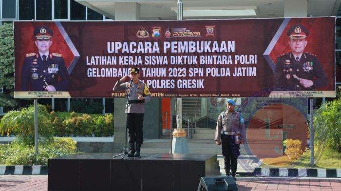 GRESIK lintasjatimnews. com – Kapolres Gresik AKBP Adhitya Panji Anom menyambut siswa Diktuba Polri Gelombang II Tahun Ajaran 2023 yang akan melaksanakan latihan kerja di Polres Gresik.