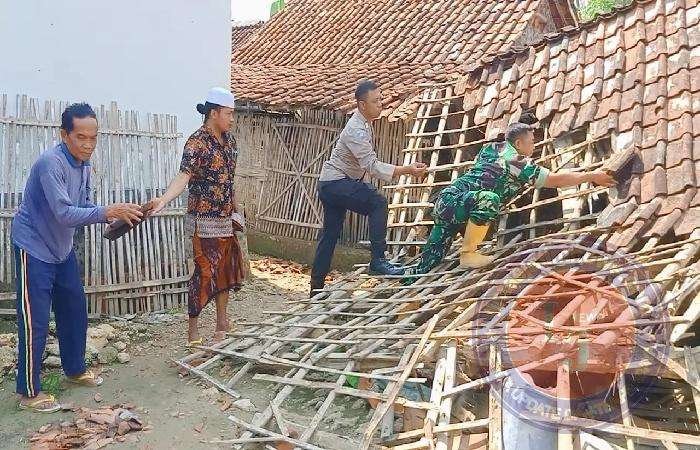Sinergitas Polisi bersama TNI dan Warga Bersihkan Rumah Roboh Akibat Angin Kencang di Sampang