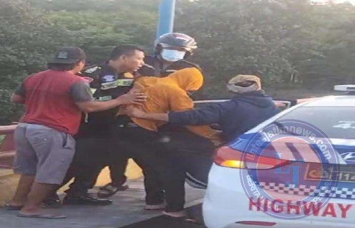 Lalu petugas dibantu beberapa warga langsung mengangkat laki-laki tersebut dari pinggir jembatan Semampir dan dimasukkan ke dalam mobil Patwal.