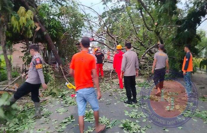 Pohon besar tersebut menutupi seluruh badan jalan yang disebabkan oleh angin kencang, sehingga pohon besar dengan lingkar pohon +- 1,5 m dengan daun yang rimbun, tercabut akarnya.