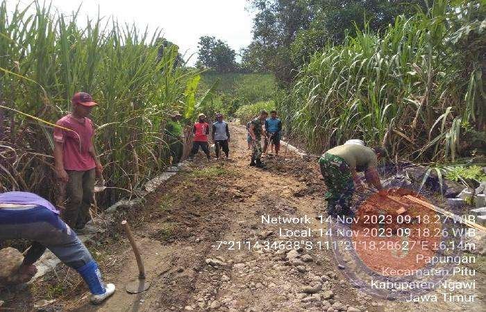 NGAWI lintasjatimnews.com – Anggota Posramil Pitu Kodim 0805/Ngawi Serda Wawan bersama warga masyarakat bersinergi melaksanakan gotong royong merapihkan jalan menuju persawahan, di Desa Papungan Kecamatan Pitu, Selasa (14/11/2023).