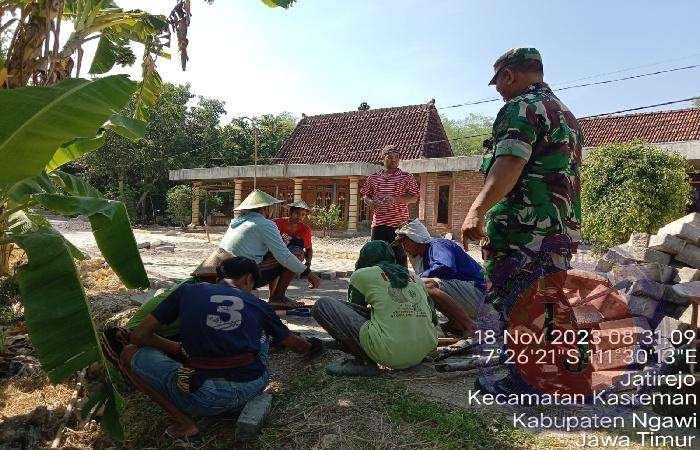 NGAWI lintasjatimnews.com – Anggota Posramil Kasreman Kodim 0805/Ngawi Serma Suyono bersama warga melaksanakan karya bakti gotong royong saling bahu membahu memasang paving blok jalan yang berada di Desa Jatirejo Kecamatan Kasreman, Sabtu (18/11/2023).
