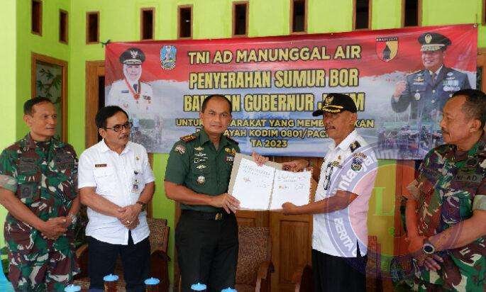 PACITAN lintasjatimnews.com – Pagi ini, Dandim 0801/Pacitan Letkol Inf Roliyanto S.I.P., M.I.P., secara resmi menyerahkan bantuan sumur bor program TNI Manunggal Air, hasil kerjasama antara Gubernur Jatim dengan Pangdam V/Brw untuk masyarakat yang membutuhkan.