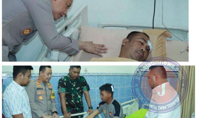 GRESIK lintasjatimnews.com – Kapolres Gresik AKBP Adhitya Panji Anom didampingi Bupati Gresik Fandi Akhmad Yani dan Dandim 0817/Gresik Letkol Inf. Ahmad Saleh Rahanar beserta Forkopimda Kabupaten Gresik menjenguk korban kerusuhan suporter di Stadion Gelora Joko samudro. Rabu (22/11/2023)