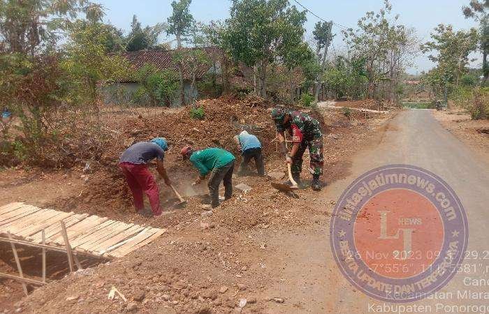 PONOROGO lintasjatimnews.com – Dukuh Tengah, tepatnya di RT. 01, RW. 02, Desa Candi, Kecamatan Mlarak, Kabupaten Ponorogo merupakan salah satu wilayah desa binaan Sertu Priyo Maryanto yang sehari – hari menjadi Bintara Pembina Desa (Babinsa) Mlarak yang mana di tempat tersebut sedang berlangsung pembuatan talud jalan oleh warga, Minggu (26/11/2023).