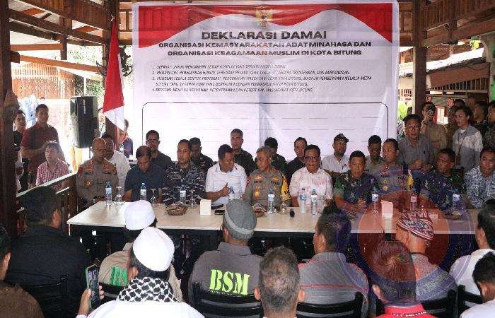 BITUNG lintasjatimnews.com – Deklarasi damai digelorakan oleh perwakilan organisasi, kemasyarakatan Minahasa dan keagamaan muslim. Deklarasi ini juga menjadi komitmen Forkopimda yang disimbolkan dengan tandatangan deklarasi damai.