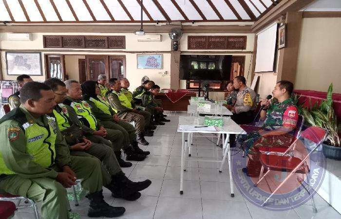 Babinsa dan Bhabimkamtibmas memberikan pembekalan dan pembinaan Linmas di Pendopo Kelurahan Banyuanyar.