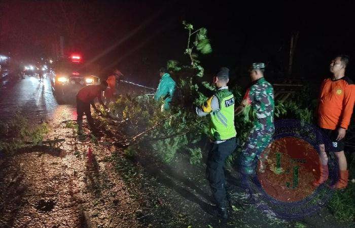Danramil 12 Bendosari Kapten Arh Budi Sarwoko monitoring situasi terkahir bersama anggota Koramil turut membantu jalannya pembersihan pohon-pohon tumbang bersama BPBD dan para relawan