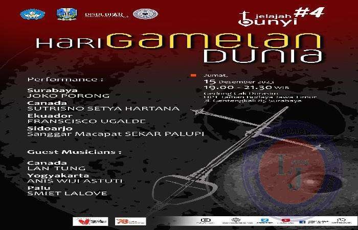 Dalam menyongsong dan memperingati Gamelan sebagai warisan dunia yang tak benda, yang akan diselenggarakan pada tanggal 15 Desember 2023, jam 19:00 – 21:30 WIB, di Taman Budaya Jawa Timur (Gedung Cak Durasim), Jl. Gentengkali 85 Surabaya.