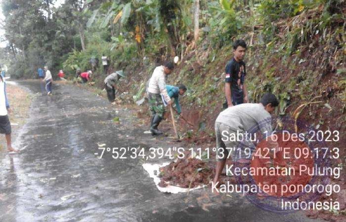 PONOROGO lintasjatimnews.com – Serma Purnomo, anggota Koramil Tipe B 0802/17 Pulung, Kodim 0802/Ponorogo hari ini melaksanakan kegiatan kerja bakti bersama warga Dukuh Surodipo, Desa Wayang, Kecamatan Pulung, Kabupaten Ponorogo, Sabtu (16/12/2023).