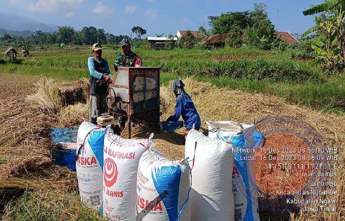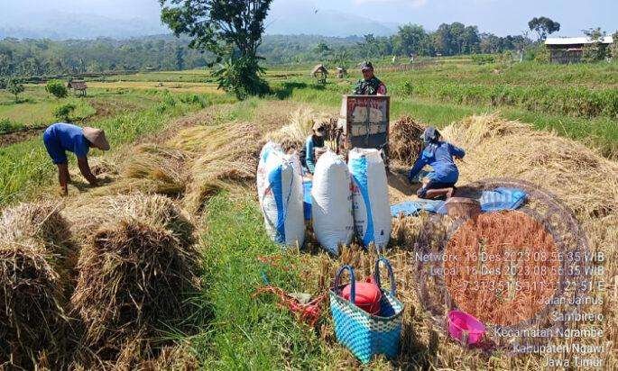 NGAWI lintasjatimnews.com – Kegiatan pendampingan dalam sektor ketahanan pangan yang dilakukan oleh Babinsa Koramil Ngrambe Kodim 0805/Ngawi Sertu Supriyanto bersama sama petani melaksanakan panen padi di sawah milik Bapak Jiman di Desa Sambirejo Kecamatan Ngrambe,Sabtu (16/12/2023).