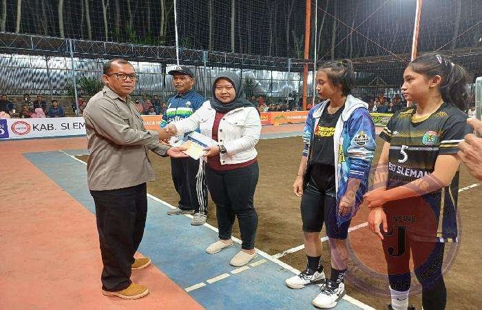 SLEMAN lintasjatimnews.com – Danramil 01/Cangkringan jajaran Kodim 0732/Sleman Kapten Chb Suparno menyerahkan Piala pada Grand Final Gelaran turnamen Bola Voli Kejuaraan Kabupaten Senior Tahun 2023 yang di selenggarakan oleh PBVSI Kabupaten Sleman di Lapangan Orange Arena Kalurahan Glagaharjo Kapanewon Cangkringan Sleman,Sabtu (16/12/2023).