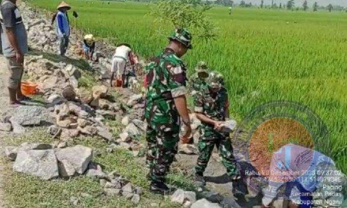 NGAWI lintasjatimnews.com – Anggota Koramil 0805/04 Padas Kodim 0805/Ngawi Serka Agus Martalam bersama masyarakat sedang melaksanakan gotong royong pembangunan talud bertempat di Desa Pacing Kecamatan Padas, Rabu (20/12/2023).