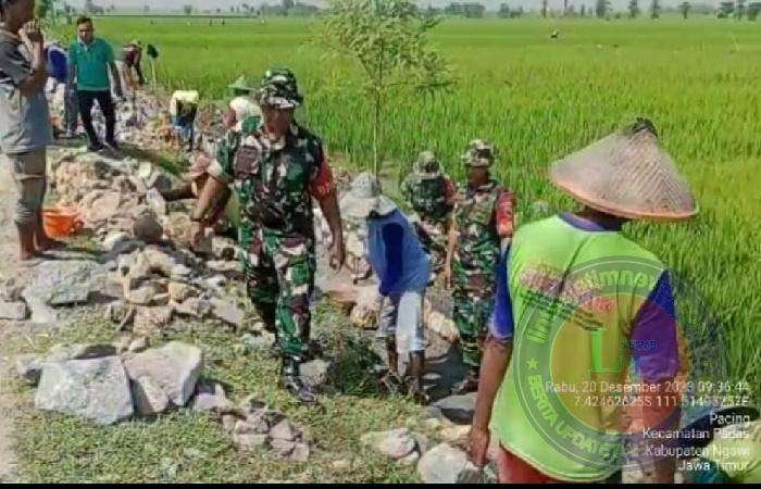 NGAWI lintasjatimnews.com – Anggota Koramil 0805/04 Padas Kodim 0805/Ngawi Serka Agus Martalam bersama masyarakat sedang melaksanakan gotong royong pembangunan talud bertempat di Desa Pacing Kecamatan Padas, Rabu (20/12/2023).