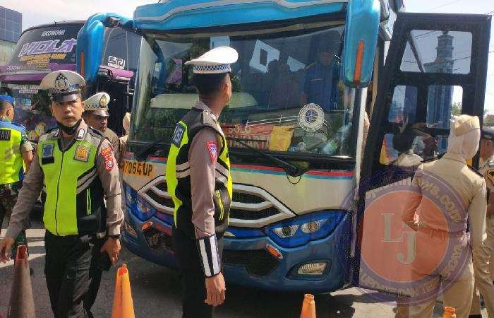 Petugas yang merupakan tim gabungan melakukan pengecekan pada beberapa komponen kendaraan bus yang vital.