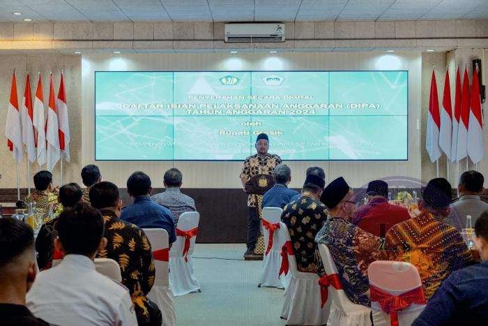GRESIK lintasjatimnews.com – Bupati Gresik Fandi Akhmad Yani, menyerahkan Daftar Isian Pelaksanaan Anggaran (DIPA) tahun anggaran 2024 yang bersumber dari APBN dengan jumlah total Rp 2.366.056.790.000,- kepada satuan kerja (Satker) yang ada di Wilayah Kabupaten Gresik secara digital. Bertempat di Kantor Bupati Gresik, kegiatan ini juga dihadiri oleh Forkopimda dan pelaksana anggaran di masing-masing Satker.Kamis (21 Desember 2023)
