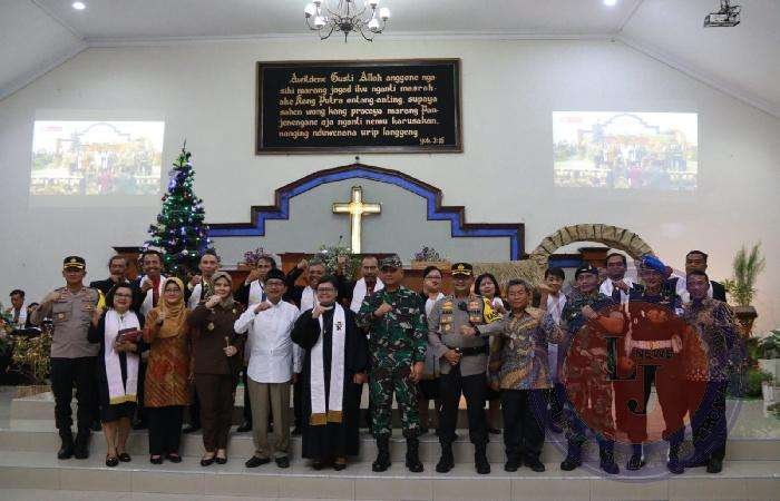 SRAGEN lintasjatimnews.com – Natal adalah hari raya umat Kristen yang diperingati setiap tahun oleh umat Kristiani pada tanggal 25 Desember setiap tahunnya. Perayaan tersebut untuk memperingati hari kelahiran Yesus Kristus. Natal dirayakan dalam kebaktian malam pada tanggal 24 Desember dan kebaktian pagi tanggal 25 Desember. Dandim 0725/Sragen Letkol Inf Yoga Yastinanda, S.I.P bersama Wakil Bupati Sragen H.Suroto, Kapolres Sragen AKBP Jamal Alam, SH, SIK, M.Si, Kajari Sragen Virginia Hariztavianne, SH, MH, Wadanyon 408 Mayor Inf Hendri Kuswanto, Dansub Denpom Kapten Cpm Hadi dan Forkompimda lainnya sambangi gereja yang sedang melaksanakan misa. Minggu, 24/12/2023.