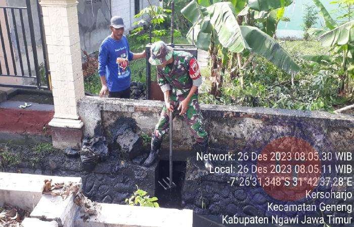 NGAWI lintasjatimnews.com – Untuk mewujudkan Kemanunggalan TNI dan rakyat anggota Koramil Geneng Kodim 0805/Ngawi Sertu Agung melaksanakan kerja bakti pembersihan saluran air di Jalan Raya Klitik – Kersoharjo tepatnya di Dsn.Kerso 1 Ds.Kersoharjo Kec. Geneng, Selasa (26/12/2023).