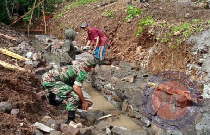 Babinsa Serma Joko Mulyono mengatakan kami bersama masyarakat gotong royong mengejar proses pembuatan talud sebagai upaya antisipasi terjadinya longsor.