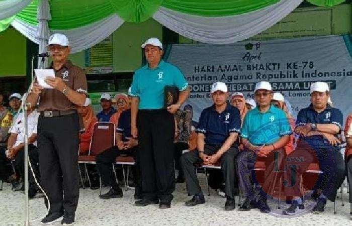 Kepala Kepala Kantor Kementerian Agama Kabupaten Lamongan H Syamsuri selaku Inspektur Apel. Dalam membacakan sambutan tertulis Menteri Agama Yaqut Cholil Qoumas menyampaikan sejarah Kementerian Agama.