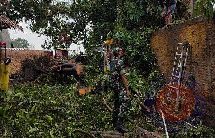 Babinsa Koramil 08/Banyudono Kodim 0724/Boyolali Sertu Wazin bersama warga bergerak cepat membantu evakuasi pohon tumbang tersebut, Jumat (05/01/2024).