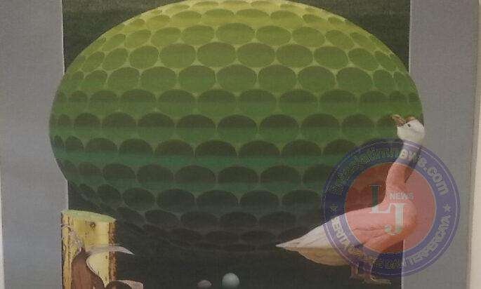 Pada karya “Golf 7”, tampak dua sapuan tegak abu-abu menghimpit bidang kehijauan sebagai latar belakang bola golf yang menyita ruang kanvas, di depannya seekor angsa menoleh ke arah bola, dua butir telur tergeletak, di pojok kiri bawah ada potongan pohon pisang layu. Idiom yang disajikan semacam kolase, hadir tanpa keterhubungan satu sama lainnya.