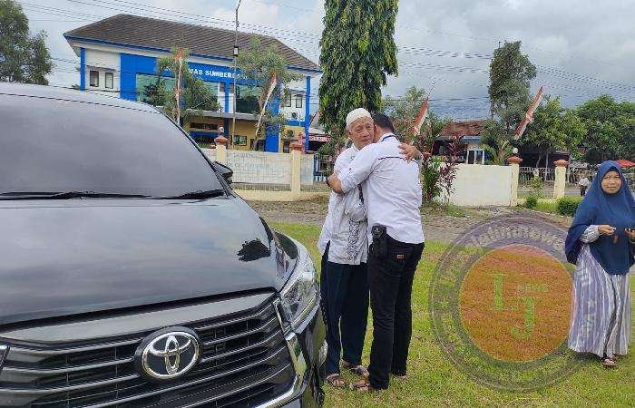 JEMBER lintasjatimnews.com – Tak tahan membendung kerinduan yang tertahan seorang polisi ini menangis sesenggukan saat sambut kiainya di depan kantor polisi tempat dia kerja.