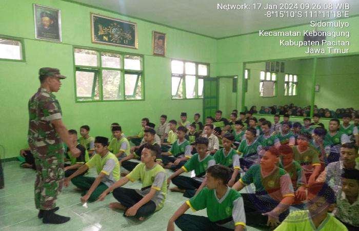 PACITAN lintasjatimnews.com – Untuk mengantisipasi kerawanan terhadap generasi muda akibat pengaruh globalisasi saat ini, anggota Koramil 0801/02 Kebonagung Kodim 0801/Pacitan memberikan pembinaan kepada para pelajar di MTs Ma’arif 04 Sidomulyo, Kec. Kebonagung, Kab. Pacitan, Rabu (17/01/2024).