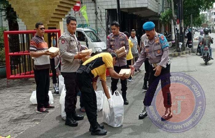 Dengan membawa 100 nasi kotak yang berisi telur ayam daging sapi sayuran dan nasi kemudian dibagikan ke warga sekitar Polsek Simokerto dan pengendara yang melintas seperti ojek online, sopir truk serta jukir