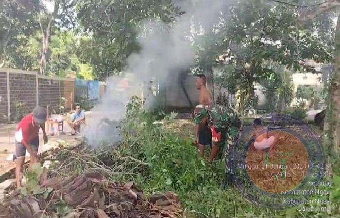 NGAWI lintasjatimnews.com – Babinsa Koramil 01/Ngawi Kodim 0805/Ngawi Koptu Ilham Romadhon bersama masyarakat melaksanakan Gotong-royong membersihkan lingkungan bertempat di Kelurahan Ketanggi Kecamatan Ngawi Kota, Minggu (21/01/2024).