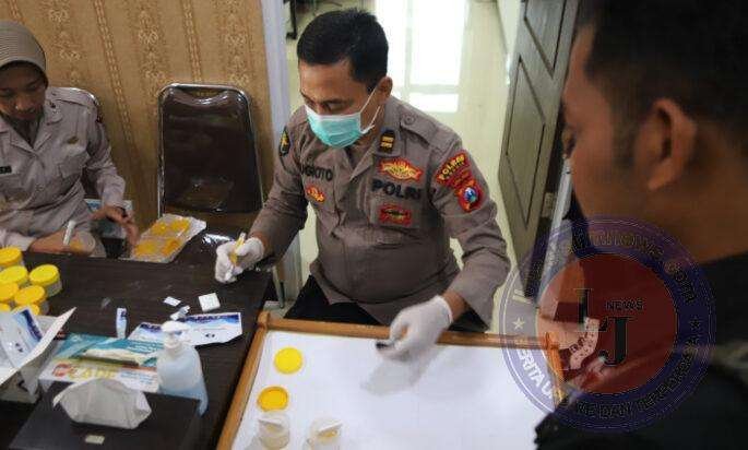 Selain pengecekan senpi, Polres Gresik juga melakukan test urine kepada seluruh anggotanya. Test urine ini dilakukan untuk memastikan bahwa anggota Polres Gresik bebas narkoba.
