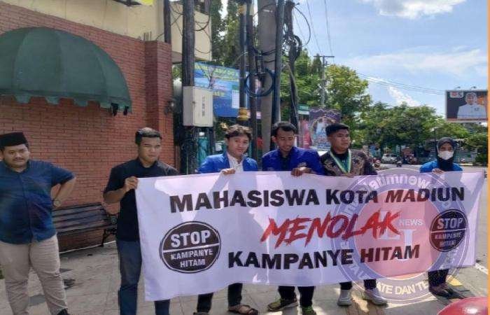 Peserta aksi membentangkan banner bertuliskan “Mahasiswa Kota Madiun Menolak Kampanye Hitam” di simpang lima Patung Pendekar.