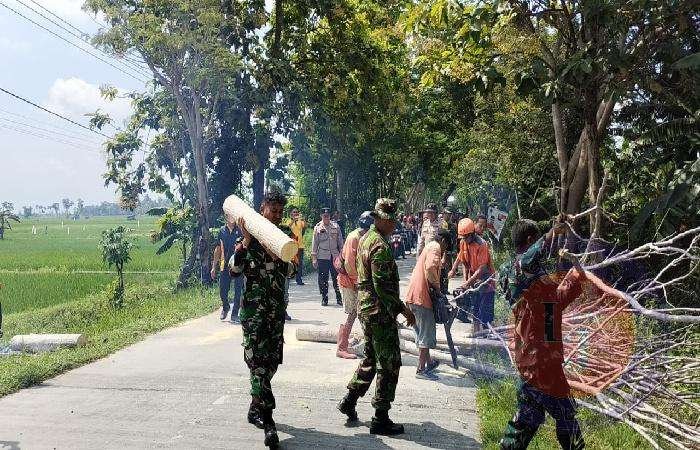 NGAWI lin – Demi menjaga Keselamatan Warga, Anggota Koramil 04/Padas Kodim 0805/Ngawi bersama relawan dan masyarakat menebangi pohon-pohon yang sudah tua di jalan poros utama,di Desa Padas, Kecamatan Padas, Kabupaten Ngawi. Jum’at (26/01/2024).