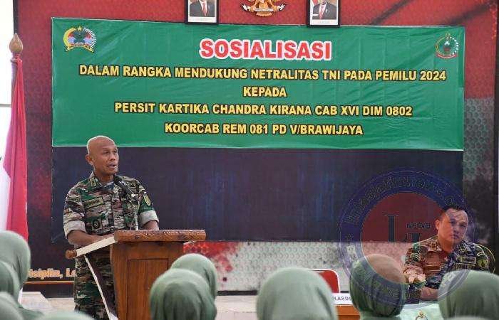 Sosialisasi dalam mendukung netralitas TNI dihadiri oleh anggota Persit baik dari Koramil jajaran dan Makodim 0802/Ponorogo tersebut digelar di Gedung Pamungkas Kodim 0802/Ponorogo. Penyampaian materi diberikan oleh Kasdim 0802/Ponorogo, Mayor Inf Misirin.