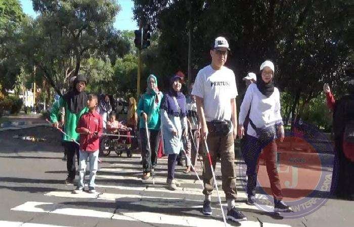 Puluhan tunanetra memperagakan cara berjalan di trotoar dan menyeberangi lampu merah.