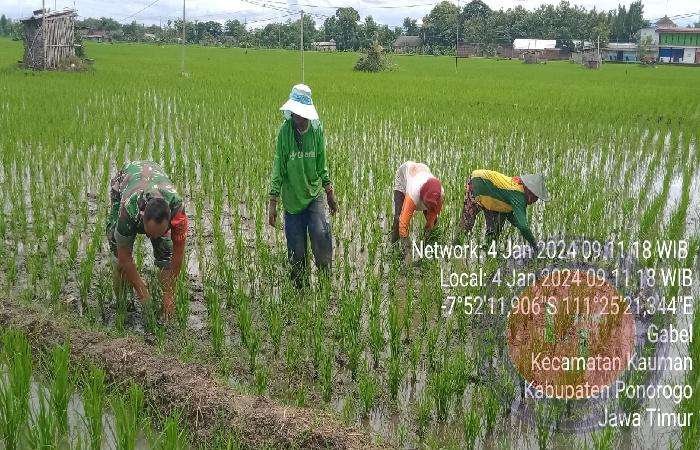 Seperti hari ini ada kegiatan penyiangan gulma pengganggu tanaman padi di hamparan lahan Kelompok Tani (Poktan) Mulyo Dusun Minar, Desa Gabel, Kecamatan Kauman, Kabupaten Ponorogo. Dengan ringan tangan Sertu Andi Sujarwanto membantu aktivitas warga tersebut dengan ikut turun ke sawah dan berbaur ikut menyiangi gulma.